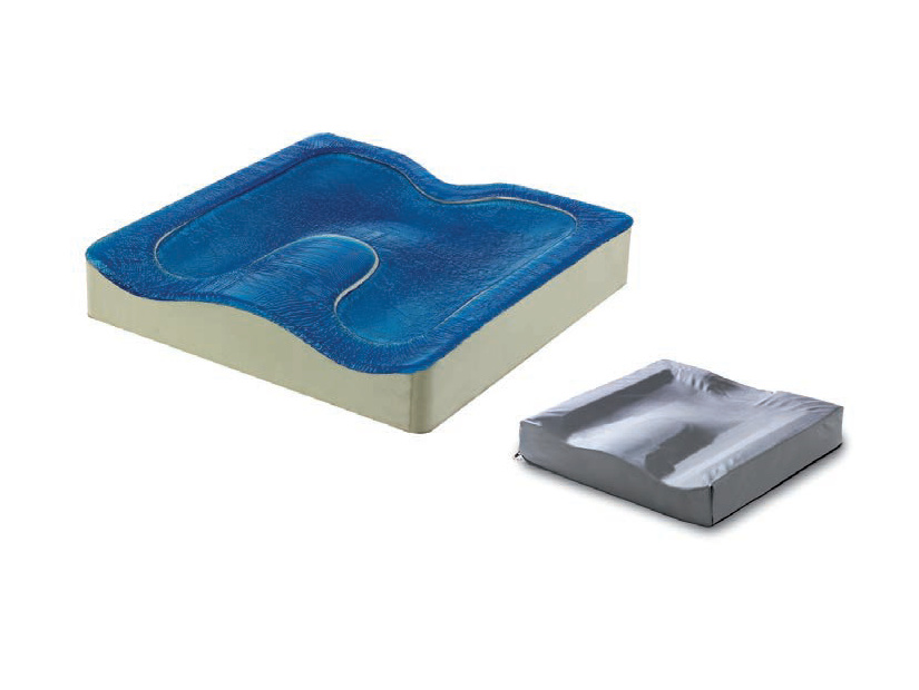Cuscino in gel viscoelastico compatto. Base anatomica automodellante e incavo posteriore per scarico delle pressioni localizzate.